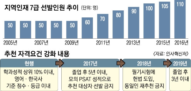 지역인재 시험은 공직 사회의 지역 대표성과 다양성을 높이고 지방대를 활성화한다는 취지로 2005년 도입됐다. 지난해까지 이 시험으로 865명이 공직에 발을 들였다. 전국 각 대학으로부터 졸업(예정)자 4~5명씩을 추천받아 공직적격성평가(PSAT), 서류, 면접으로만 선발한다. 종전의 학교장 추천 자격요건은 학과 성적 10% 이내, 영어 성적, 한국사 등급 외에 학교장 자율에 맡겼다.