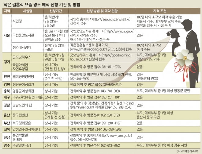 서울시 내 가장 인기가 많았던 작은 결혼식 장소는 서초구에 위치한 국립중앙도서관이었다. 모두 42쌍의 예비부부가 이곳을 택했다. 이 밖에 38쌍은 충북 영동군 여성회관, 25쌍은 서울 시민청, 21쌍은 부산 서구청 웨딩홀에서 결혼식을 올렸다.