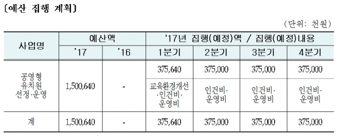 세부일정은 공영형 유치원 선정(공영형유치원선정위원회) 및 사전협의(17년 1~2월), 공영형 유치원 운영(17년 3월~협약기간), 공영형 유치원 종합평가(17년 10~11월)로 진행된다.