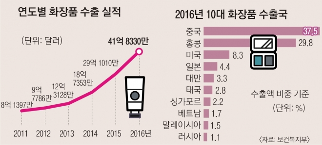 작년 화장품 수출 41억弗, 43% ‘껑충’