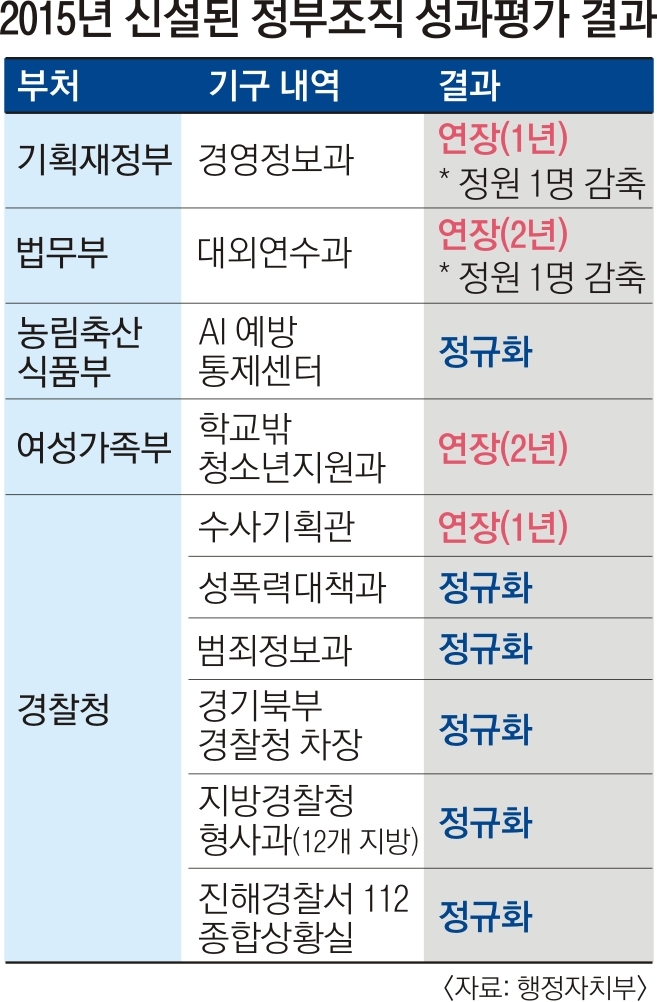 제도 도입 후 처음 시행된 이번 성과평가에서 폐지 결정을 받은 기구는 단 한 곳도 없었다. 반면 그대로 운영될 예정인 조직은 모두 17개다. 농림축산식품부 조류인플루엔자(AI) 예방통제센터, 경찰청 성폭력대책과, 범죄정보과, 경기북부경찰청 차장, 12개 지방경찰청 형사과, 진해경찰서 112 종합상황실이 포함됐다.