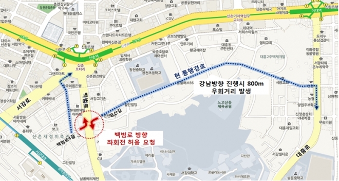 9일 서울시의회 김상훈의원(더불어민주당, 마포1)은 이면도로(고산길, 백범로4길)에서 백범로 방향 좌회전 불가로 원거리 우회에 따른 주민불편이 많았던 신촌 르메이에르타운 앞 좌회전이 허용된다고 밝혔다.