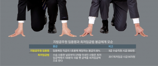 올 1월 마침내 공무원이 된 A(28·행정9급)씨는 지난 2월 월급을 받아 보고 깜짝 놀랐다. 전북 진안군의 9급 공무원 A씨의 급여는 봉급 111만 6640원에 직급 보조비 12만 5000원을 합해 124만 1640원이었다. 이 급여는 제과점 아르바이트인 친구보다 훨씬 적은 수준이었다. 법정 근로시간인 월 209시간 근무하는 것을 기준으로 시급을 환산하면 5950원이다. 2017년 근로자 최저임금 시급으로 결정된 6470원보다 520원이 적었다.