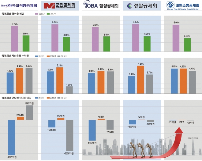 2015년만 보면 교직원공제회(1085억원)만 제외하고 4곳 모두 적자였다. 적자폭은 군인공제회(2320억원), 지방행정공제회(721억원), 경찰공제회(148억원), 소방공제회(25억원) 순이었다.