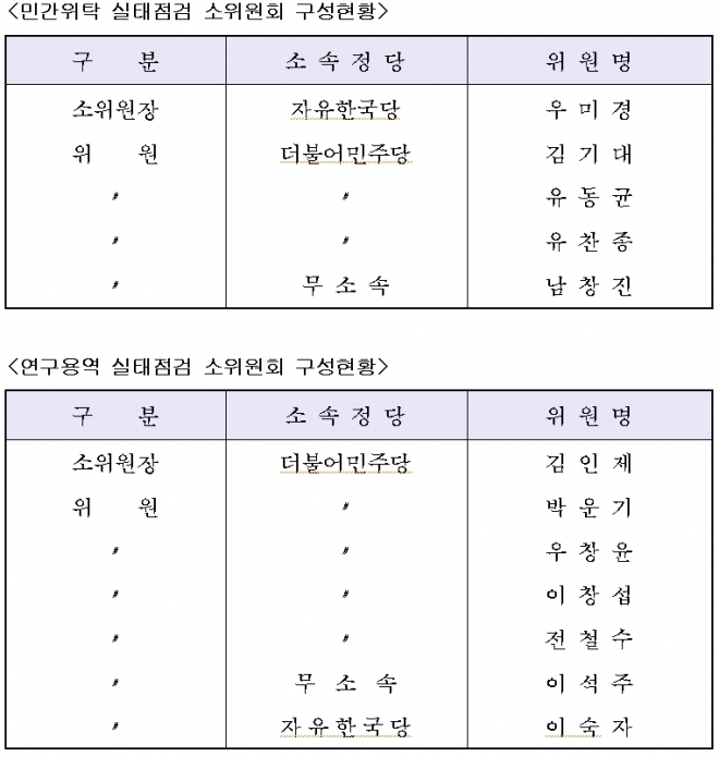 참고로, 민간위탁 및 연구용역 실태점검을 위해 지난해 말 구성된 2개 소위원회는 3개월간의 활동기간(‘16.12.20~’17.3.19) 동안 요구자료에 대한 서면검토와 3차에 걸친 집중회의, 현장방문, 관계자 면담 및 설문조사 등 업무 특성을 반영한 맞춤형 점검활동을 벌인 결과 소기의 성과를 도출했으며, 4월 개최예정인 상임위원회 회의중 활동결과를 보고할 예정이다.