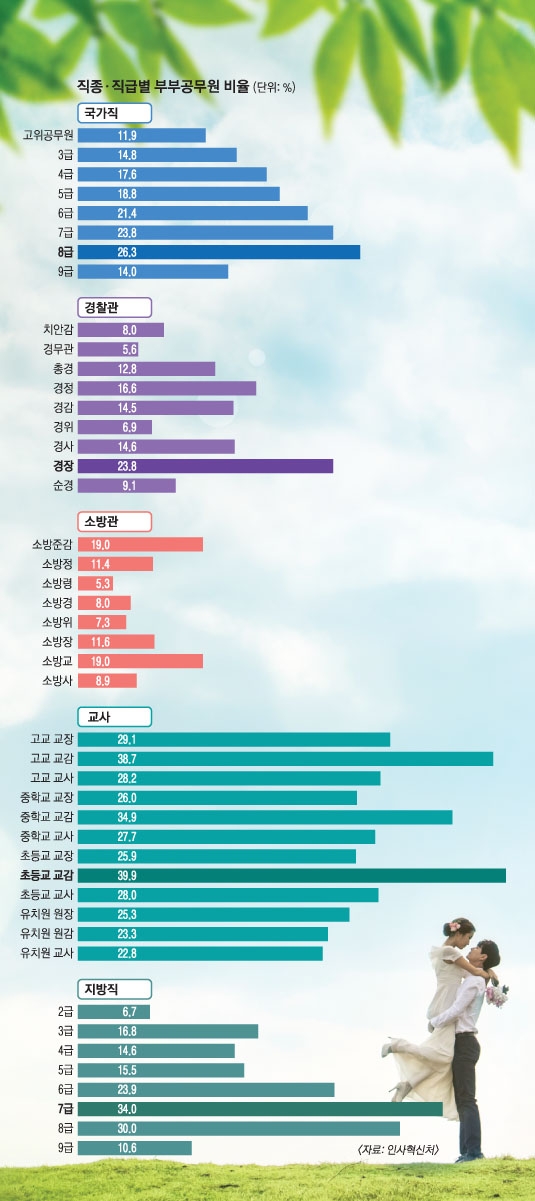 부부 공무원들이 같은 지역에서 일하고 싶어하지만 같은 부처나 같은 부서에서 근무하는 것까지 선호하는 경우는 드물다. 승진이나 연수 등에서 불이익을 받을 수 있다는 우려 때문이다. 중앙부처에 근무하는 B(39·5급)씨는 “아내와 같은 직급으로 시작했지만, 두 사람 모두 승진하는 경우는 지금까지 한 번도 없었다”며 “같은 시기에 승진할 경우 좁은 조직 안에서 ‘편의를 봐준다’, ‘어떻게 부부가 다 승진할 수 있느냐’는 말이 나온다”고 말했다. 김진동 국민대 행정대학원 교수의 연구에 따르면 같은 기관에 근무하는 부부 공무원은 상대적으로 업무에 몰입하지 못하는 경우가 적지 않다. 부부가 서로에 대해 눈치를 보기도 하고 다른 직원들이 자신들 때문에 불편해할까 봐 걱정하기도 한다는 것이다. 부산시 소방직 공무원 C(32·여)씨는 “현장 업무의 특성상 대체인력을 구하기 어려워 1년 넘는 육아휴직은 꿈도 꾸지 못한다”며 “내가 맡았던 업무까지 남은 동료들 몫이 되기 때문에 미안한 마음에 눈치를 볼 수밖에 없다”고 전했다.