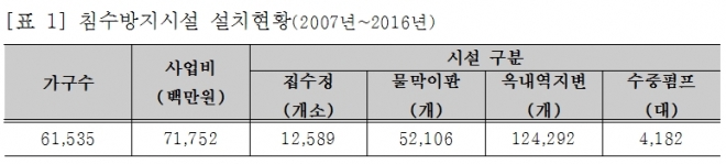 한편, 서울시는 2007년부터 지난해까지 총 6만2천여 침수취약 지하주택 물막이판, 역류방지시설, 수중펌프 등 침수방지시설을 지원하였고, 올해는 5천여 가구에 가구에 지원할 예정에 있으며, 자치구 수요조사의 경우 2012년부터 2016년까지 총 351건 2,520억 46백만원이 요청되어 이 중 총 246건이 가결되어 1,483억 94백만원이 지원됐다.