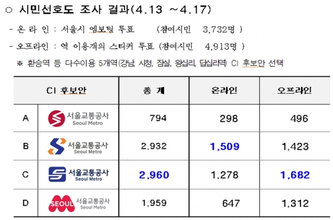 실제로 시는 시각 디자인 분야 전문가 등의 심사를 거쳐 시민의 안전을 최우선 가치로 삼고 활용성이 높은 4개 안을 우선 선정했다. 그런 뒤 공사의 CI를 시민들이 직접 뽑을 수 있도록 지난달 13~ 17일 서울시 엠보팅 홈페이지(mvoting.seoul.go.kr)와 지하철 5개역(강남, 시청, 잠실, 왕십리, 답십리역)에서 시민 선호도 조사를 실시했다.