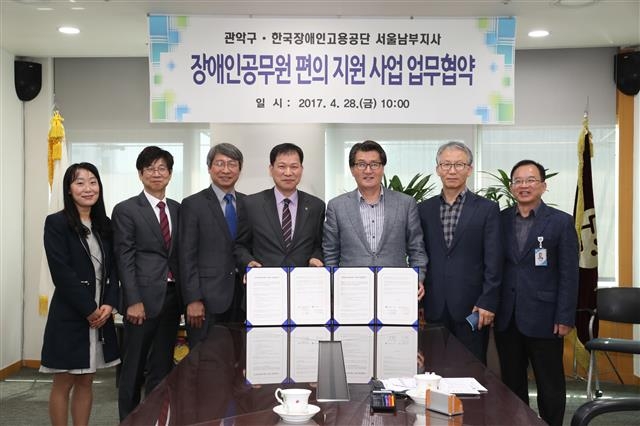 유종필(오른쪽 세번째) 관악구청장은 “장애인공무원에 대한 전문적이고 체계적인 지원을 통해 효율적인 근무환경을 조성하겠다”면서 “장애인과 함께 꿈꾸는 행복한 관악을 만들기 위해 더욱 노력하겠다”고 말했다.