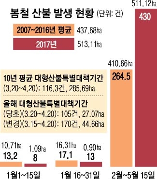 18일 산림청에 따르면 2007~2016년까지 최근 10년간 봄철산불조심기간(2월 1~5월 15일)에 연평균 264.5건의 산불로 410.6㏊의 피해가 발생했다. 특히 3∼4월은 산불 최대 위험기간으로 연간 발생 산불의 49.3%, 피해면적의 78.0%가 집중된다. 이에 따라 산림청은 그동안 3월 20일부터 4월 20일까지 한 달간을 대형산불특별대책기간으로 운용하고 있다.