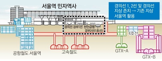 기존 철길 가운데 고속철도 시설은 철거 후 지하로 옮기고 화물전용선은 용산역으로 이전한다. 지하에는 철도·지하철·버스 환승시스템이 들어서고 지상에는 상업·유통시설이 건립된다. 서울역 주변 철도 건설은 물론 역세권 개발, 도로교통체계 개선, 동서 간 보행연계 방안 등이 포함된 일종의 서울역 종합 개발안이다. 이 사업은 2025~2030년에 완료될 전망이다. 서울역 개발이 끝나면 서울역의 하루 철도 이용객은 지금의 33만명에서 82만명으로 증가한다.