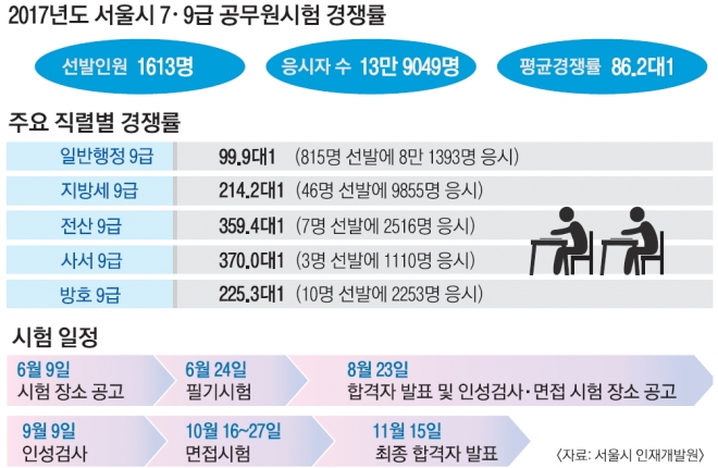 올해 서울시 7·9급 공채 필기시험 장소가 다음달 9일 서울시인터넷원서접수센터(gosi.seoul.go.kr)에 공고된다.올해 1613명을 뽑는 서울시 공채 1차 관문인 필기시험은 다음달 24일 서울 시내 중·고등학교에서 열릴 예정이다. 앞서 3월 13~20일 진행된 원서접수에는 13만 9049명이 몰려 86.2대1의 평균 경쟁률을 나타냈다.
