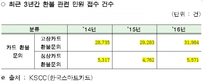 서울시의회 유 용 의원(더불어민주당·동작4)이 서울시 도시교통본부에서 받아본 자료에 따르면 정상카드의 환불 접수 건수는 매년 증가하여 지난 3년간 7,920,879건이었고, 고장카드는 293,498건으로 집계됐다. 매년 증가 추세인 카드 환불건수에서 나타나듯 환불 방법에 관한 민원 접수 건수도 증가하고 있는 것으로 드러났다.