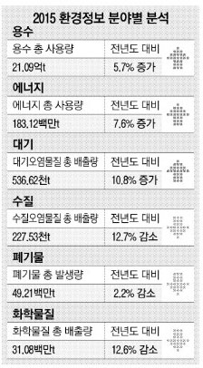 대기오염물질 배출량은 늘어난 반면 수질 오염 배출량은 감소한 것으로 나타났다29일 환경부와 한국환경산업기술원이 2015년 국내 1383개 기관의 8720개 사업장의 환경정보를 분석한 보고서에 따르면 용수 사용량은 21억 900t으로 2014년보다 5.7% 증가했다.