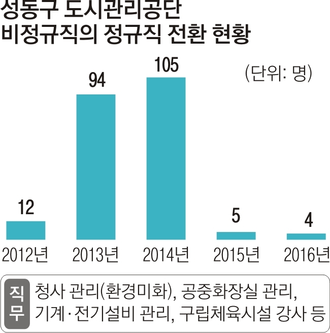 정 구청장은 취임 첫해 구 산하 도시관리공단의 비정규직 105명을 시작으로 지난해까지 이 공단 소속 비정규직 220명을 모두 정규직(무기계약직)으로 전환했다. 청사 환경 미화, 공중화장실 관리, 기계·전기설비 관리, 구립체육시설 강사 등 업무도 다양하다. 무기계약직 처우는 기존 정규직과 똑같다. 고용노동부는 지난달 발간한 ‘공공부문 비정규직 대책 업무 매뉴얼’에서 성동구 도시관리공단의 비정규직 정규직 전환을 모범 사례로 소개하기도 했다.