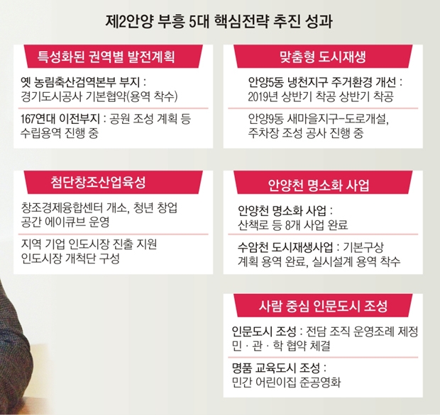 “바로 눈에 띄지는 않지만 조금씩 쇠퇴해 가다 어느 순간 갑자기 도시는 황폐한 모습을 보입니다.” 이 시장은 현 위기를 극복하고 새로운 미래를 위한 전환점을 만들어야 했다. 많은 고심과 준비 끝에 지난해 2월 ‘제2 안양 부흥 비전’을 선포했다. 희망찬 비전도시, 따뜻한 인문도시, 힘 있는 경제도시, 여유로운 힐링도시를 목표로 특성화된 권역별 발전계획 수립, 사람 중심의 인문도시 조성, 안양천 명소화 사업 추진 등 5대 핵심 전략 사업을 내세웠다.
