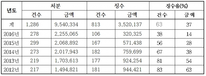 이는 징수율이 매년 감소했기 때문으로 분석된다. 2012년 63%(부과금 14억9482만원, 징수금 9억4442만원), 2013년 54%(부과금 17억631만원, 징수금 9억2425만원), 2014년 38%(부과금 20억1794만원, 징수금 7억5969만원), 2015년 28%(부과금 20억6889만원, 징수금 5억7143만원) 그리고 지난해 최저치를 찍었다. 22억5506만원을 부과해 14%인 3억2032만원을 거둬들였다.