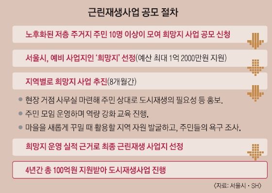 서울시의 근린재생사업이 다른 지역과 비교해 특별한 건 ‘희망지’ 제도 때문이다. 근린재생사업은 낙후 지역 주민 10명이 뜻을 모아 “도시재생사업으로 마을을 바꿔 보겠다”고 서울시에 신청하면 시작된다. 시는 대상지 여부를 바로 가리는 대신 예비 사업지 성격인 ‘희망지’ 신분을 준다. 또 초기자금을 1억 2000만원까지 지원한 뒤 8개월간 지켜본다. 도시재생이 주민 주도로 마을을 바꾸는 사업인 만큼 주민 스스로 역량을 키울 수 있는 준비 기간을 주겠다는 취지다. 주민들은 이 기간 거점 사무실을 마련하고 이웃을 설득한다. 시 관계자는 “낯선 개념의 정비 사업인 도시재생을 일방 추진하면 주민들이 거부감을 느끼게 된다”면서 “도시재생이 뭔지, 우리 마을에 왜 필요한지 등을 주민끼리 허심탄회하게 얘기해 공감대를 쌓는 시간이 필요하다”고 말했다.