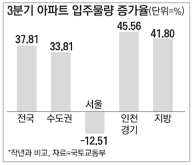전국 아파트 입주물량은 지난해 같은 기간에 비해 40% 가까이 급증했지만 서울 입주량은 오히려 10% 이상 감소하는 것으로 나타났다.