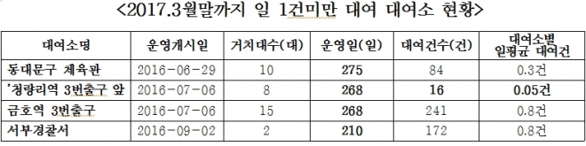 문제는 대여소를 주먹구구식으로 설치하다 보니 하루 이용자가 3명도 채 안된다. 이마저 하루에 한 명도 찾지 않는 대여소도 생겨났다.