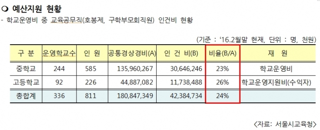 교육공무직의 인건비는 초등학교는 현재 월급제로 동일하나 중학교는 월급제와 호봉제로 급여 유형이 달라 그동안 교육공무직(호봉제)의 인건비가 공통경상운영비에 포함 되었다. 따라서 교육공무직(호봉제)의 인원수가 많은 학교의 경우, 학교 운영비 규모가 줄어들 수밖에 없다.