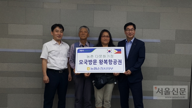 농협순천시지부는 6일 필리핀이 고향인 라모스(59)씨에게 가족과 함께 친정을 방문할 수 있는 왕복항공권과 체재비를 전달했다.