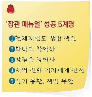①천재지변도 장관 책임 ②화나도 참아라 ③밤잠은 잊어라 ④새벽 전화 기자에게 친절 ⑤임기 유한, 책임 무한