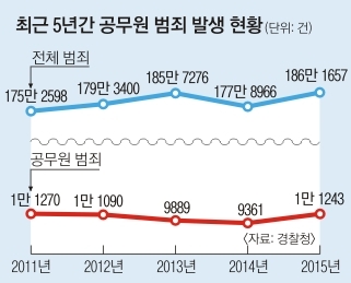 특히 범죄를 저지를 경우에는 일반인 신분으로 형사처벌을 받은 뒤 소속 기관에서 공무원이라는 이유로 한 차례 더 징계를 받는다. 징계를 통해 해임이나 파면이 될 경우 노후 자금인 공무원연금도 삭감된다. 16일 경찰청에 따르면 2015년 공무원 범죄는 1만 1243건이 발생해 전체 범죄 186만 1657건의 0.6%에 불과하다.