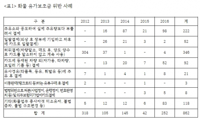 유형별로 보면 화물은 허위 결제(차량 말소, 매도 후, 양도·양수 후 카드를 말소하지 않고 계속 사용)가 가장 많은 346건이 발생했다. 이어 ▲주유소와 공모하여 실제 주유량보다 부풀려서 결제 222건 ▲카드에 등재된 차량 외(자가용, 타차량, 보일러 기름 등) 결제 92건 ▲일괄 결제(외상 후 장부에 기입하고 차후에 카드로 일괄 결제) 52건 등이다.