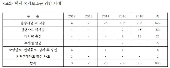 택시는 운송사업 외 사용이 가장 많은 522건이 들통났다. 이어 ▲관련 자료 미제출 53건 ▲타차량 충전 21건 ▲차령만료, 면허취소, 감차 후 충전 6건 등이다.
