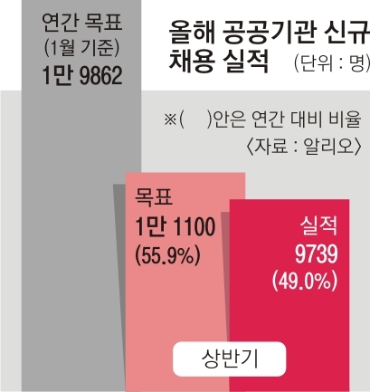 7일 공공기관 경영정보 공개시스템(알리오)에 따르면 올해 상반기 공공기관 신규채용 규모는 9739명이었다. 이는 기획재정부가 올해 1월 공공기관 상반기 채용확대 계획을 발표하면서 밝힌 상반기 목표치(1만 1100명, 55.9%)에 1361명 모자란 49.0%다. 공공기관의 2013∼2015년 상반기 신규채용 평균인 50%에도 미치지 못한다.