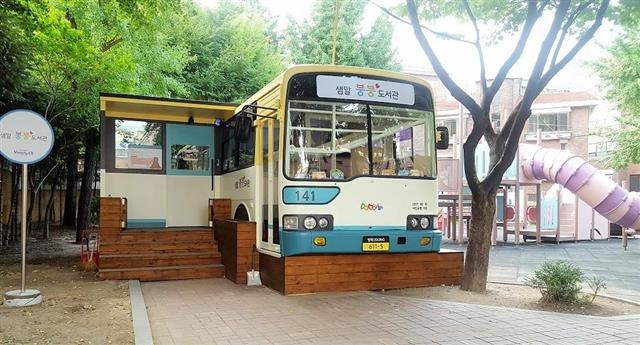 버스도서관이라는 콘셉트와 어우러지도록 공원 내 놀이기구를 도색하고 정류장 테마의 벤치와 조형물도 새롭게 마련했다. 구가 버스도서관을 마련한 것은 2013년 개관한 ‘창골마을 붕붕도서관’, 지난해 개관한 ‘둘리마을 붕붕도서관’에 이어 세 번째다.