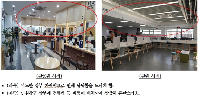 이날 김 의원이 제시한 현장사진을 보면 통일되지 못한 상부마감으로 인한 개방감 저해, 민원창구 상부에 컴퓨터 본체, 모니터 등 비품 배치로 인한 혼란, 불필요한 설치물로 인한 공간활용성 저해 등 다양한 문제가 나타나고 있는 것으로 확인되었다.(사례 참조)