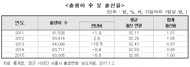 2014년 기준 우리나라의 합계출산율은 OECD 평균 1.68명보다 낮은 1.21명이며, 서울시는 이보다도 훨씬 낮은 0.98명(2015년 1.00명)으로 매우 심각한 상황에 처해 있다.