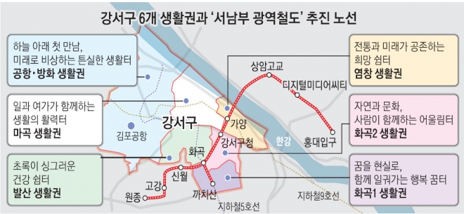 -공항·방화생활권은 ‘하늘 아래 첫 만남, 설렘의 시작’, 마곡생활권은 ‘일과 여가가 함께하는 생활의 활력 터’, 발산생활권은 ‘초록이 싱그러운 건강쉼터’, 염창생활권은 ‘전통과 미래가 공존하는 염창생활권’, 화곡1생활권은 ‘꿈을 현실로, 함께 일궈 가는 행복 꿈 터’, 화곡2생활권은 ‘자연과 문화, 사람이 함께하는 어울림 터’다.
