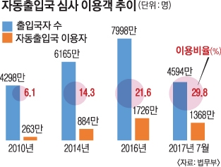 2008년 3820만명이었던 출입국자 수는 지난해 7998만명으로 2배 이상으로 늘었다. 출입국자 수가 급증하면서 출입국심사관의 인력 부족이 초래될 가능성이 높았다. 하지만 출입국자 대비 자동출입국심사 이용 인원 비중이 2008년 2.2%에서 지난해 21.6%로 높아지면서 인력부족이나 서비스의 질 저하로 이어지지 않았다는 게 법무부 설명이다. 올해에는 사전 등록 절차도 폐지되면서 이용객이 급증해 전체 출입국 인원(4594만명) 대비 29.8%가 자동출입국심사를 이용하고 있다.