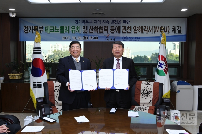 백경현(오른쪽) 경기 구리시장과 우제창(왼쪽) 서일대학교 총장은 구리와 남양주시가 공동 유치 추진중인 경기북부 2차 테크노밸리 입주기업 지원 등을 위한 업무협약(MOU)을 체결했다고 31일 밝혔다.