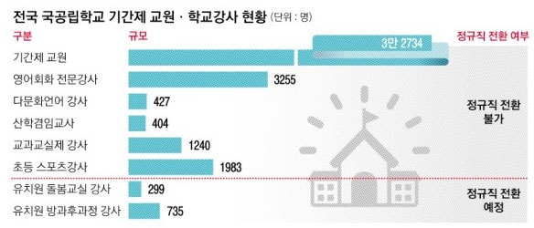 유치원 돌봄교실 강사 299명, 유치원 방과후과정 강사 735명. 교육부가 지난달 11일 시·도교육청에 비정규직의 정규직 전환을 권고한 이들의 숫자다. 그러나 이 숫자 뒤에는 더 큰 숫자가 남았다. 기간제 교사 3만 2743명, 영어회화 전문강사 3255명, 다문화 언어강사 427명, 산학겸임교사 404명, 교과교실제 강사 1240명, 초등 스포츠 강사 1983명. 학교 비정규직 가운데 정규직 전환에서 제외된 이들의 숫자다. 정부가 공공부문 비정규직의 정규직 전환에 박차를 가하고 있다. 고용노동부는 1일 현재까지 기간제 노동자 1만 1000여명(114곳), 파견·용역 노동자 2000여명(41곳)을 정규직으로 전환하기로 했다고 밝혔다. 지난달 발표한 연차별 전환계획에는 올해 안에 7만 4000명(기간제 5만 1000명, 파견·용역 2만 3000명)을 정규직으로 전환한다는 내용이 담겼다. 정부는 올 하반기를 시작으로 2020년까지 모두 20만 5000명을 정규직으로 전환할 계획이다.