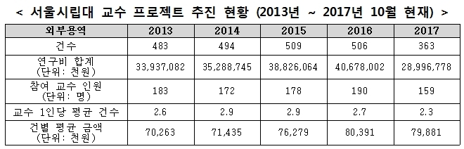 올해의 경우, 서울시립대 교수 현원 총 418명 중 159명의 교수가 외부용역에 참여했다. 전체 교수의 3분의 1이 넘는 인원이 외부용역을 수행한 것이다. 교수 1인당 평균 2.3개의 외부용역을 수행했으며, 건별 금액은 평균 8천만 원 가까이 된다. 또한 5개 이상의 외부용역을 수행한 교수는 총 18명이며, 이중 연구비가 10억 원이 넘는 규모의 외부용역을 수행한 교수는 A교수를 비롯, 13억 원의 B교수, 14억원의 C교수 등 총 세 명이나 된다. 서울시립대 교수의 평균 연봉이 약 1억500만 원임을 감안할 때, 이들은 연봉을 훨씬 상회하는 수준의 수입을 외부용역에서 얻고 있다고 볼 수 있다.