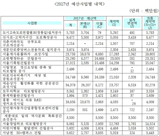 도시기반시설본부가 김춘수의원에게 제출한 ‘2017년 예산사업별 내역’에 따르면 △ 선사로~고덕지구간 도로확장공사 34억1,900만원, △ 새문안로 중앙버스전용차로 설치공사 16억1,800만원, △ 서울재사용플라자 조성사업 23억4,200만원, △ 마포석유비축기지 재생 및 공원조성공사 23억2,600만원, △ 세운상가 활성화를 위한 공공공간 조성사업 85억1,900만원 등의 사업에서 설계변경이 이뤄졌고, 이로 인해 277억8,300만원의 예산이 증액된 것으로 나타났다.