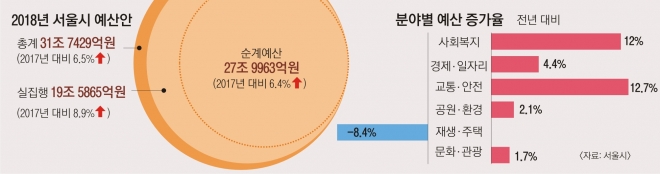 내년도 서울시 예산 가운데 가장 눈에 띄는 부분은 복지 예산이다. 올해보다 1조 504억원(12%) 증가, 9조 8239억원이 배정돼 ‘10조원 시대’를 눈앞에 뒀다. 내년에는 국공립 어린이집을 250개 늘려 총 1000개 시대를 열겠다는 계획이다. 만 5세 이하 모든 아동에게 월 10만원의 아동수당을 지급하는 등 출산·양육 지원을 위해 2조 1951억원을 배정했다. 기초연금 인상, 독거노인·고령 부부 가사 지원 등 어르신 생활 안정을 위한 지원도 대폭 강화했다. 윤준병 서울시 기획조정실장은 “내년은 1인당 평균 복지 예산이 100만원 시대가 되는 한 해가 될 것으로 예상된다”고 말했다.