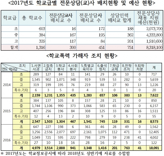 오 의원은 “상담 활성화를 위해서는 전문상담(교)사의 배치가 절실하다. 전문상담(교)사가 없는 학교는 일주일에 2~3번 방문하므로 신뢰도가 떨어진다”고 지적했다.