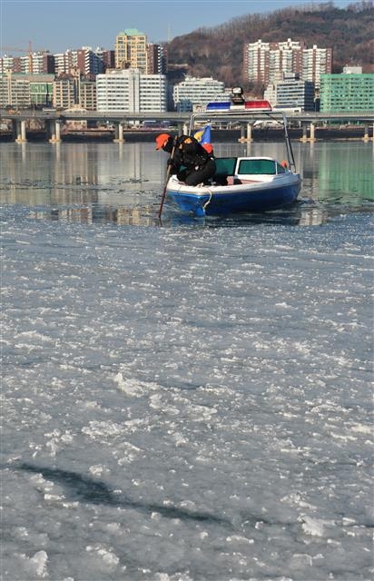 강물이 얼음 다리를 풀고 있다.