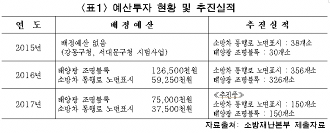 서울소방재난본부는 서울시 내에 소방차 통행불가지역을 해결하기 위해 ‘소방차 통행로’ 노면표시와 함께 이를 알리기 위한 태양광조명블록 설치사업을 함께 추진하고 있으며, 2015년부터 추진된 이 사업은 현재까지 소방차 통행로 노면표시가 총 544개소, 태양광 블록이 총 506개소 설치됐다.