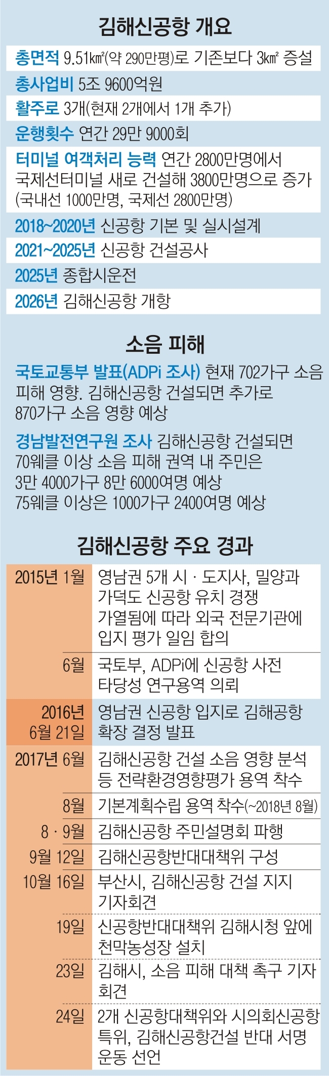 국토부는 2015년 6월 파리공항공단엔지니어링(ADPi)에 영남권 신공항 입지평가 용역을 맡겼으며, 1년 뒤 경남 밀양이나 부산 가덕도에 건설하지 않고 김해공항을 확장하기로 결정해 지난해 6월 21일 발표했다. 이어 지난해 7월 한국개발연구원(KDI)에 의뢰해 9개월간 예비타당성 조사를 한 결과 총사업비 5조 9600억원으로 비용 대비 편익(BC) 0.94, 종합평가(AHP)분석 0.507로 타당성이 있는 것으로 나왔다.