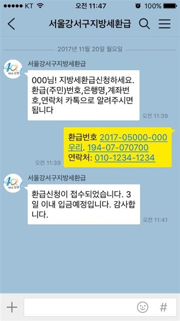 카카오톡 플러스친구에서 ‘서울강서구지방세환급, ID:gangseo6164’를 추가한 뒤 환급통지서의 환급번호와 본인 명의 계좌번호를 카카오톡으로 전송하면 신청 후 3일 이내 환급금을 받을 수 있다. 환급 신청은 24시간 가능하다. 카카오톡으로 미환급금 기부 신청도 할 수 있으며 기부금은 사회복지공동모금회를 통해 어려운 이웃에게 전달된다.