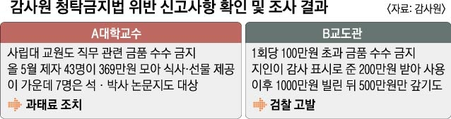 스승과 제자 간 관례적 상황으로 볼 수 있지만 청탁금지법은 어떤 경우에도 직무 관련자에게 금품을 받는 것을 금지하고 있다. 감사원은 교육부 장관에게 “A교수와 제자 7명의 청탁금지법 위반 사실을 해당 대학교 이사장이 과태료 재판 관할법원에 통보하게 하라”고 통보했다.