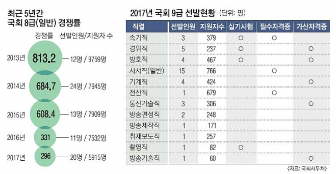 2017년도 국회직 9급은 선발 예정인원(40명)에 지역인재 1명(사서직 일반)을 더한 41명이 최종 선발 인원으로 확정됐다. 접수 인원은 4088명이었지만 실제 시험에 응시한 인원은 1791명(43.8%)에 불과했으며, 최종합격자 중 여성은 20명으로 전체의 절반에 가까웠다.