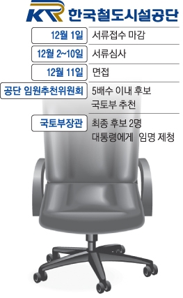 공단 임원추천위원회는 공모자를 대상으로 서류심사와 오는 11일 면접을 거쳐 5배수 이내 후보자를 국토부에 추천할 계획이다. 국토부 장관은 최종 2명의 후보를 선정해 대통령에게 임명 제청하게 된다. 이에 따라 내년 2월 평창동계올림픽을 앞두고 오는 22일 개통 예정인 수도권과 강릉을 잇는 첫 고속선인 경강선 개통 전에 신임 이사장 임명이 기대되고 있다.
