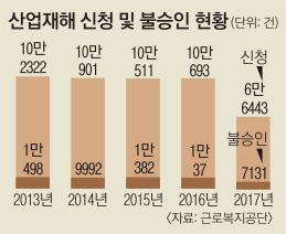 정부가 산업재해를 은폐하는 사업주를 형사처벌하는 등 산재 관련 정책을 강화하고 있지만 산재 신청을 제기한 이후 노동자들의 삶은 녹록지 않은 게 현실이다. 4일 근로복지공단에 따르면 산재 신청은 2015년 10만 511건, 2016년 10만 693건, 올해 8월까지 6만 6443건으로 해마다 10만건 이상 접수된다. 이 가운데 2015년 1만 382건(불승인율 10.3%), 2016년 1만 37건(10.0%), 올해는 7131건(10.7%)의 산재 신청이 승인되지 않았다.